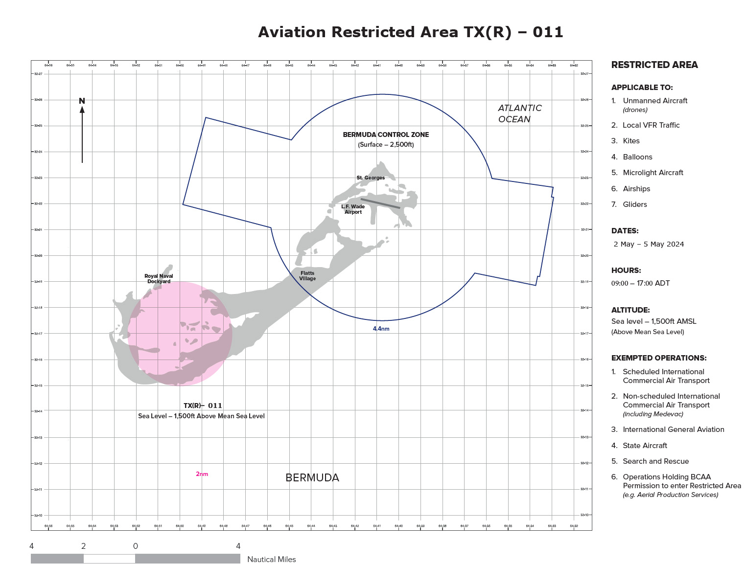 FOR IMMEDIATE RELEASE The BCAA announces temporary no-fly zone in advance of SailGP event Hamilton, Bermuda, April 29, 2024 – The Bermuda Civil Aviation Authority (BCAA) has announced a temporary no-fly zone over the Great Sound that will take effect during next month’s Apex Group Bermuda Sail Grand Prix. The restriction will cover the airspace above and around the racing event, as illustrated in the diagram below, and will be in force from 2nd May 2024 to 5th May 2024, between the hours of 9:00 a.m. and 5:00 p.m.